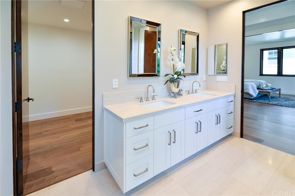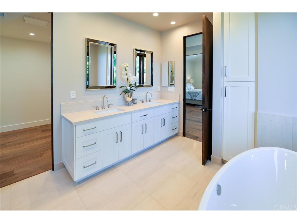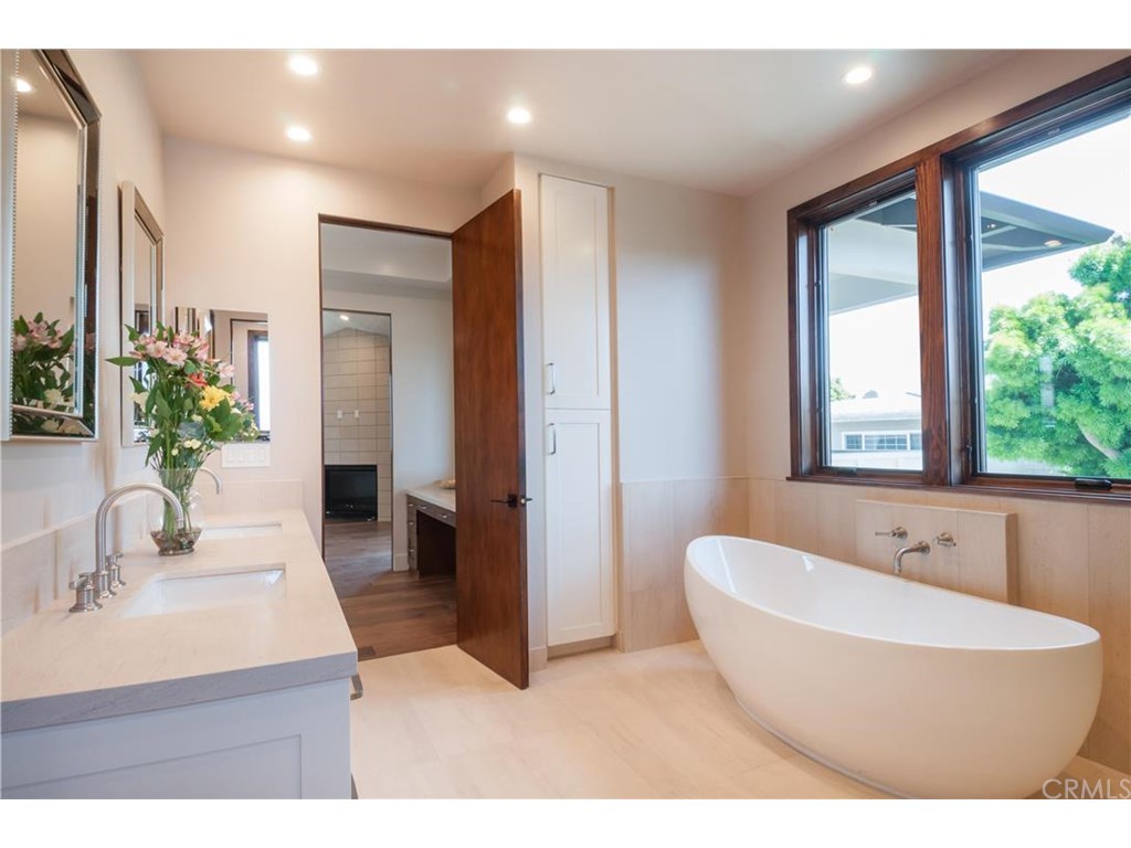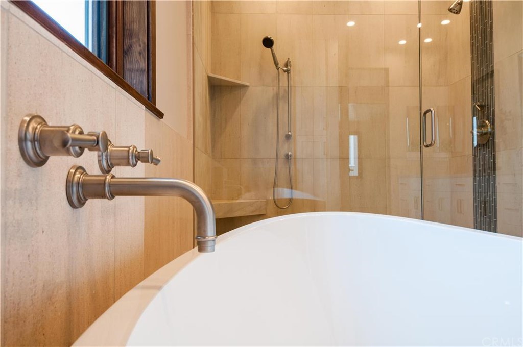 The spa-inspired primary bathroom includes a soaking tub, separate walk-in shower with handheld and rain shower heads, and elegant finishes throughout.