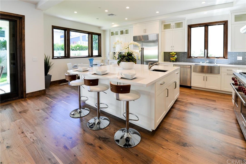 The kitchen is a chef’s dream, equipped with top-of-the-line appliances including a Wolf 6-burner range with griddle and double oven, Sub-Zero refrigerator/freezer, Bosch dishwasher, a roll-out microwave, and a beverage fridge. A large stainless steel farmhouse sink pairs with a separate salad sink set into the oversized island—ideal for hosting and meal prep alike.